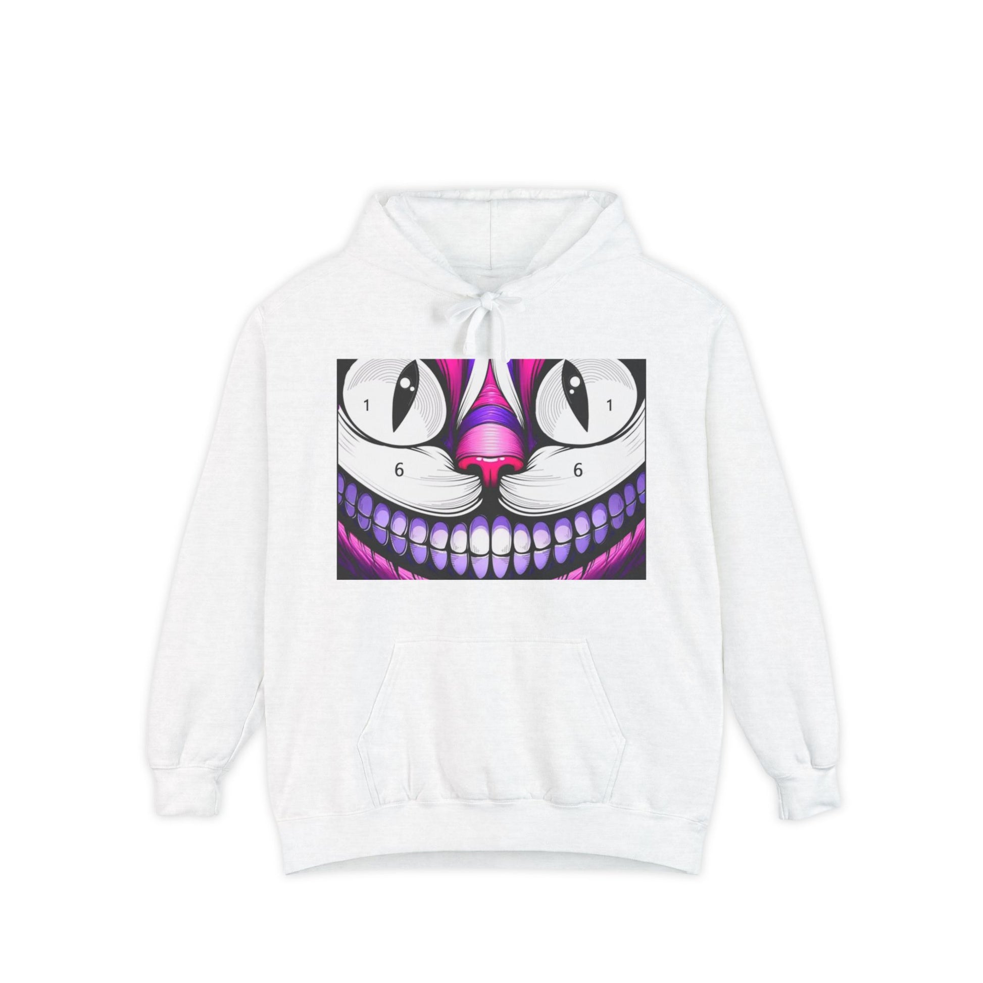 This garment-dyed hoodie carries a bold, surreal grin across the chest — a neon-infused catlike smirk that feels equal parts mischievous and electric. The heavy, ringspun cotton blend gives the print a tactile, lived-in look while the relaxed fit and ribbed cuffs hold shape through repeated wear. Slip it on for late-night city walks or cramped studio sessions; the lined hood and soft necktape make long hours comfortable. The artwork reads like a private joke to those who collect striking, offbeat streetwear — it announces you’re here for atmosphere, for color, and for the uncanny. Wear it layered over tees, under a coat, or solo when you want your outfit to do the talking.